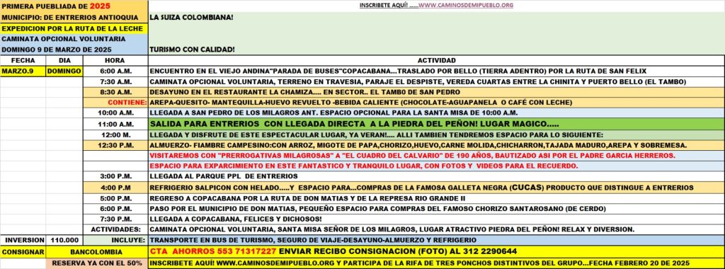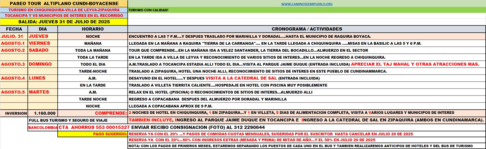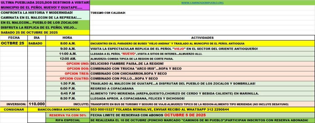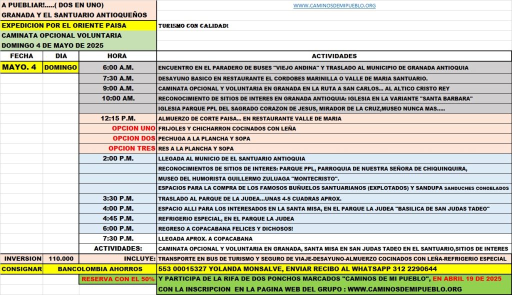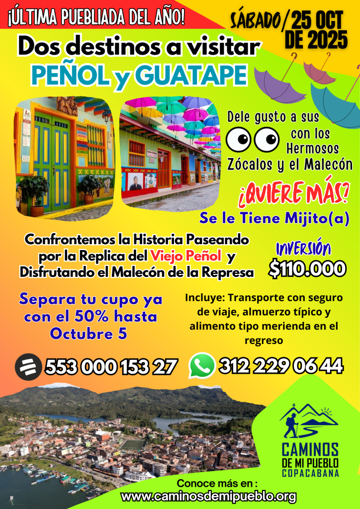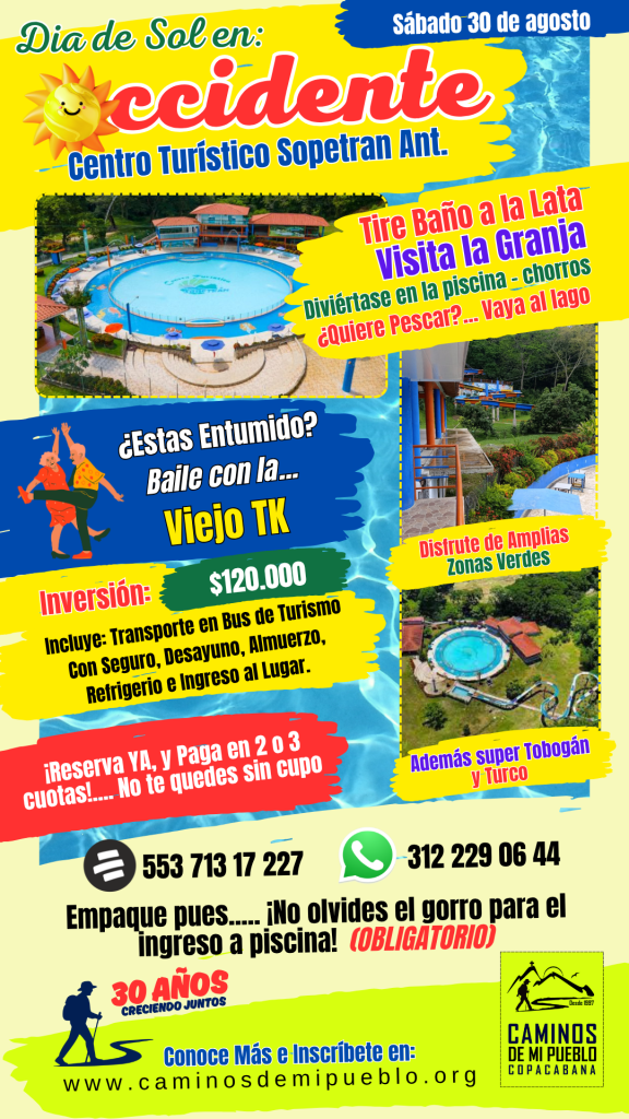 Inversión: $110.000 (Incluye transporte en bus de turismo con seguro, desayuno, almuerzo y refrigerio)