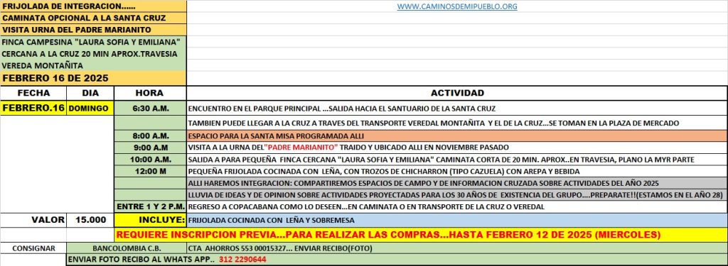 Frijolada de integración – Caminata opcional a la Santa Cruz – visita urna del padre Marianito