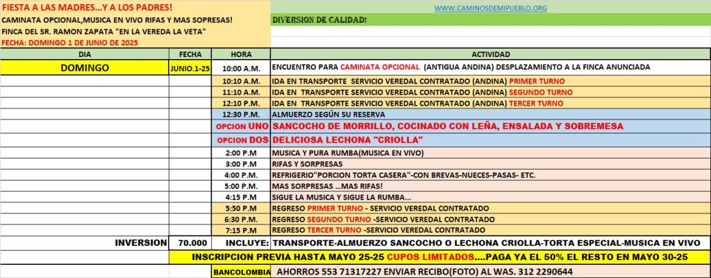 Ida a Finca Ramón Zapata – Vereda la Veta – Día de fiesta en honor a las Madres y a los Padres. Buena Comida, Torta, Rumba, Diversión, Rifas Sorpresa, Almuerzo Especial y Música en Vivo.