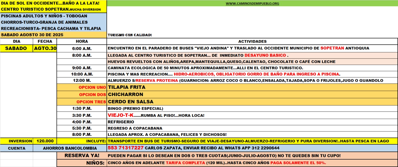 Inversión: $ 120.000 (Incluye Transporte con seguro, Desayuno, Almuerzo, Refrigerio e Ingreso al Lugar).