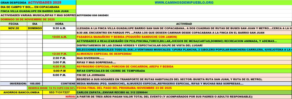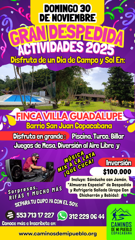 Inversión: $100.000 – Incluye: Sanduche con Jamón, Almuerzo Especial de Despedida y Refrigerio (Arepa con Chicharrón)